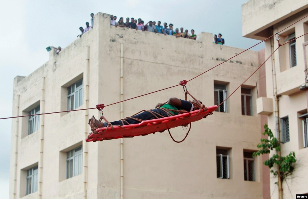 A simulated victim is lowered on a stretcher during an earthquake drill in Agartala, India.
